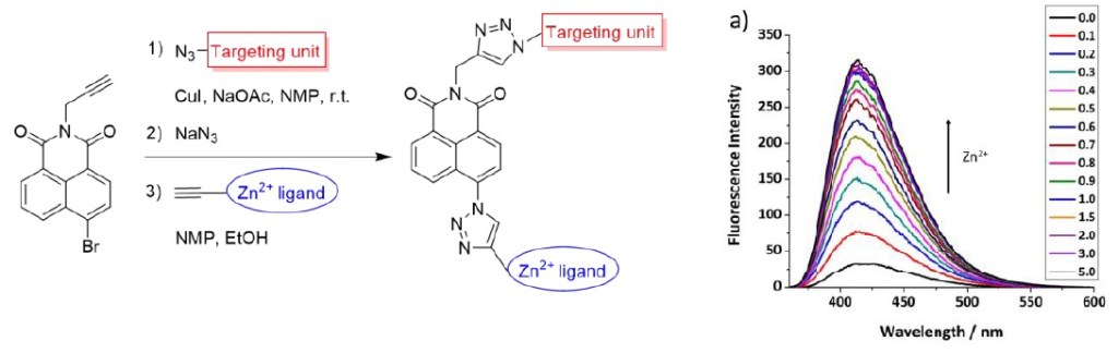 Zn2+ is involved in a number of biological processes and its wide-ranging roles at the subcellular level, especially in specific organelles, have not yet been fully established due to a lack of tools to image it effectively. We report a new and efficient modular double ‘click’ approach towards a range of sub-cellular localised probes for mobile zinc. Through this methodology, endoplasmic reticulum, mitochondria and lysosome localised probes were successfully prepared which show good fluorescence responses to mobile Zn2+ in vitro and in cellulo whilst a non-targeting probe was synthesized as a control. The methodology appears to have wide-utility for the generation of sub-cellular localised probes by incorporating specific organelle targeting vectors for mobile Zn2+ imaging.
