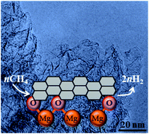 Graphene mesosponge (GMS) is a new class of mesoporous carbon consisting mainly of single-layer graphene walls. GMS has traditionally been synthesized via chemical vapour deposition (CVD) of methane onto a template of alumina (Al2O3) nanoparticles, which catalyses methane conversion. However, the Al2O3 template needs to be removed using costly and environmentally concerning processes such as hydrofluoric acid or concentrated base. In this work, we examine methane conversion catalysed by magnesium oxide (MgO) and utilized MgO as an alternative catalytic template. In contrast to Al2O3, a solid acid catalyst, MgO is a solid base catalyst that is also active for methane conversion into graphene sheets but dissolves easily in hydrochloric acid. We have investigated the reaction mechanism using in situ weight measurements and gas-emission analysis during CVD complemented by density functional theory calculations. We found that the pure MgO surface is activated via O-elimination with methane above 778 °C. On the activated MgO surface, methane is converted into a graphene sheet with a relatively low activation energy of 134 kJ mol−1. Once the first graphene layer is formed, the methane-to-graphene conversion rate decreases and the activation energy increases to 234 kJ mol−1, which is comparable to that reported in thermal methane-CVD on carbon. As a result of the faster growth rate of the first layer with respect to additional layers, it is easier to obtain single-graphene layers using MgO. The MgO-derived GMS has a unique combination of properties including a high surface area, developed mesopores, high oxidation resistance, significant softness and elasticity, very low bulk modulus (0.05 GPa), and force-driven reversible liquid–gas phase transition. Thus, we expect the MgO-derived GMS can be employed in a variety of applications including high-voltage supercapacitors and as a new type of heat pump based on the force-driven phase transition.