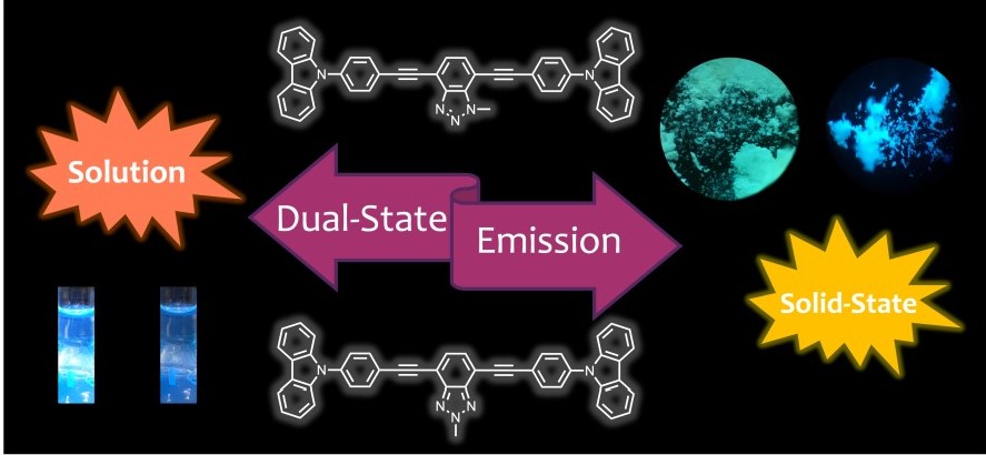 Dual-State Emission (DSE) refers to the emission of organic molecules in solution and solid-state and is an attractive but elusive property that has recently drawn significant interest. In this work, we report two conjugated compounds 1 and 2 that show good photoluminescence (PL) in solution (ФPL = 0.53 and ФPL = 0.43) and exceptional emission in the solid state (ФPL = 0.92 and ФPL = 0.84). To the best of our knowledge, this is the first report containing Donor-π-Acceptor-π-Donor (D-π-A-π-D) compounds with rotary components that adopt highly emissive states. We describe how the marked variations in PL in solution caused by changes in polarity and viscosity produce marked shifts in the emission. TD-DFT calculations indicate that these PL changes are facilitated by the existence of polarizable moieties within these rotatable molecules with the possibility of trapping in the higher energy S2 state. In the solid state, the flexibility and symmetry (or lack of it) in 1 and 2 play a crucial role producing strongly fluorescent twisted structures, as evidenced by their corresponding X-ray crystal arrays. Interestingly, the molecular torsion observed in the crystalline solids are different from those observed in solution. We attribute this novel DSE behavior to the molecular rotor D-π-A-π-D architecture that provides conformational and electronic flexibility for the systems to respond to the changes in the environment.