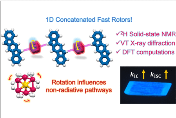 Herein, we describe a series of molecular rotors formed by cocrystallizing three indolo[3,2-b]carbazole (ICZ) derivatives with butyl and cyclohexyl substituents, along with 1,4-diaza[2.2.2]bicyclooctane (DABCO). The structures of rotors I and III were confirmed through single-crystal X-ray diffraction (SCXRD), revealing a concatenated 1D arrangement between the two components. Variable-temperature (VT) SCXRD experiments on rotors I and III suggested that the rotator shows rotational motion, with activation energies of 6.8 and 1.8 kcal mol–1, respectively. The lower activation energy for rotor III was attributed to the flexible environment around DABCO due to the presence of cyclohexyl groups, while the surroundings of rotor I were found to be more rigid. Additionally, our predictions of radiative and nonradiative decay constants indicate that the vibrations of the molecular rotors impact nonradiative decay rates and, consequently, the fluorescence quantum yields.